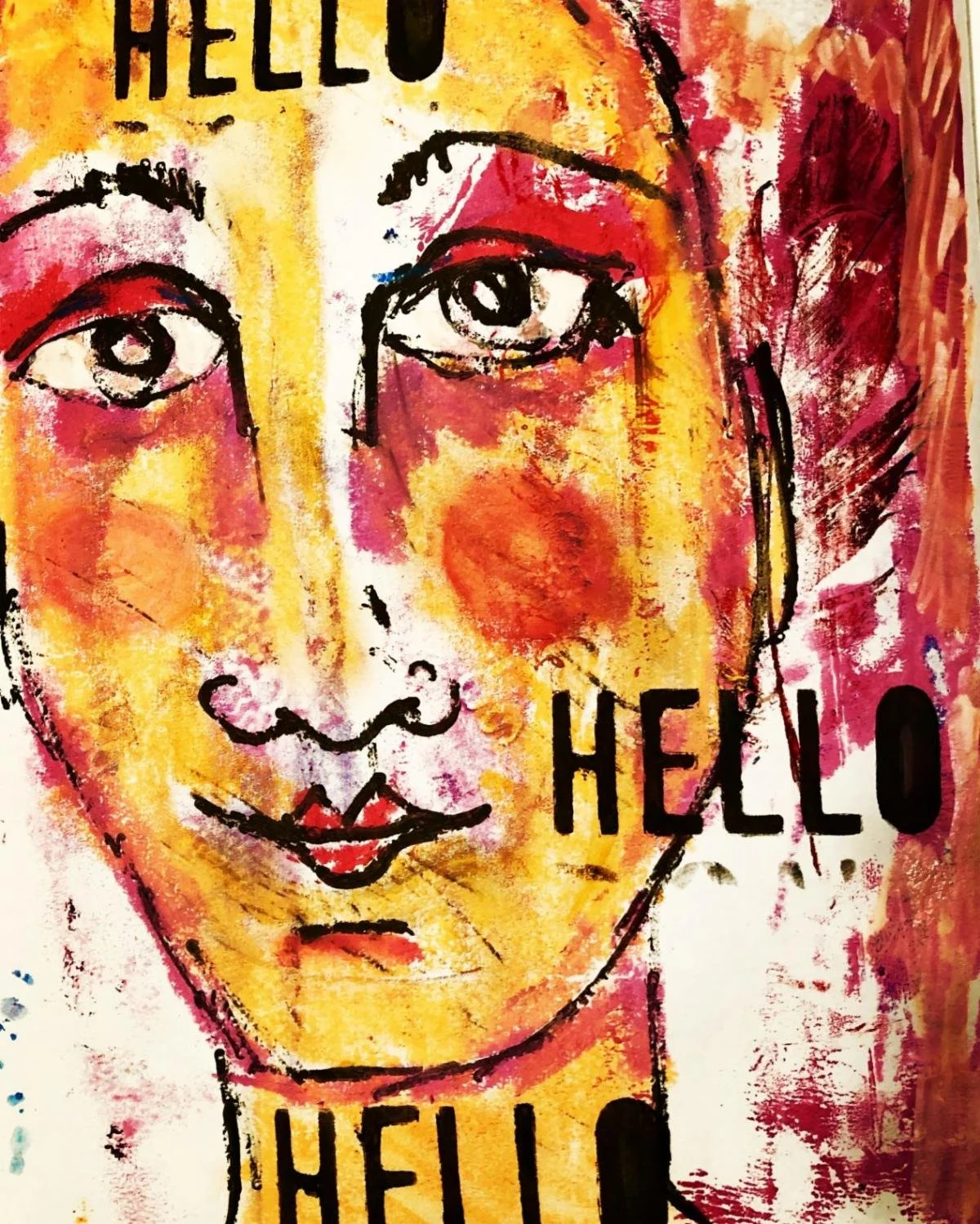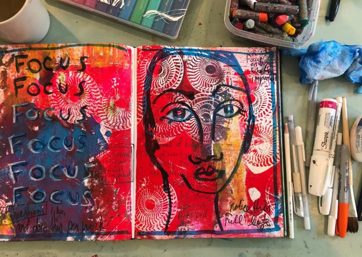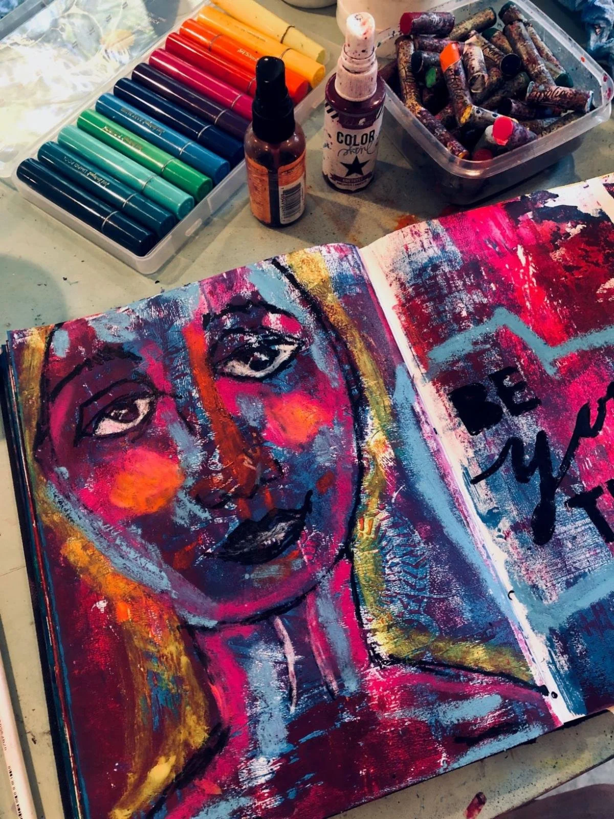 Art therapy pioneer Don Seiden once wrote that printmaking supports sensory integration and fosters a sense of power and control. The act of rolling and stamping can release physical tension and produce a sense of rhythm and flow. I just know I really like printmaking! And once the background paint is dry in my journal, it becomes a safe place to draw some faces to express whatever’s going on in my head–and in my heart.