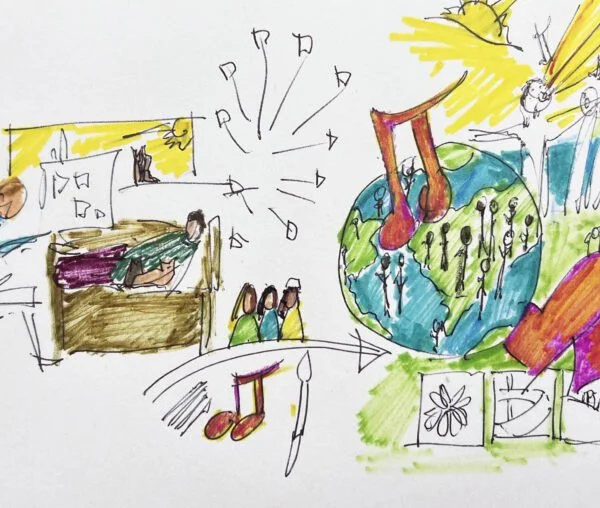 For the art part, we divided a piece of drawing paper and drew symbols for those two domains–what it looks like now and how we’d like it to be—and then included what would bridge the two realms.