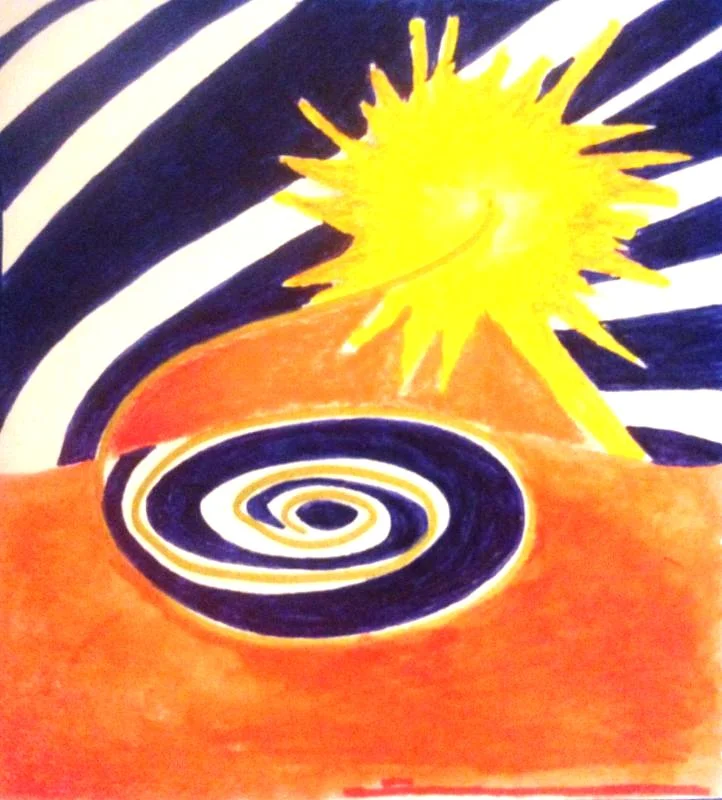 This happened recently in a workshop Rebecca was running at Miraval. She made a small mandala of what she thought of as a hopeful sun at the end of a spiral path made of gold and blue for healing and prosperity. Some of the guests commented that it looked like a fuse that culminated in an explosion.