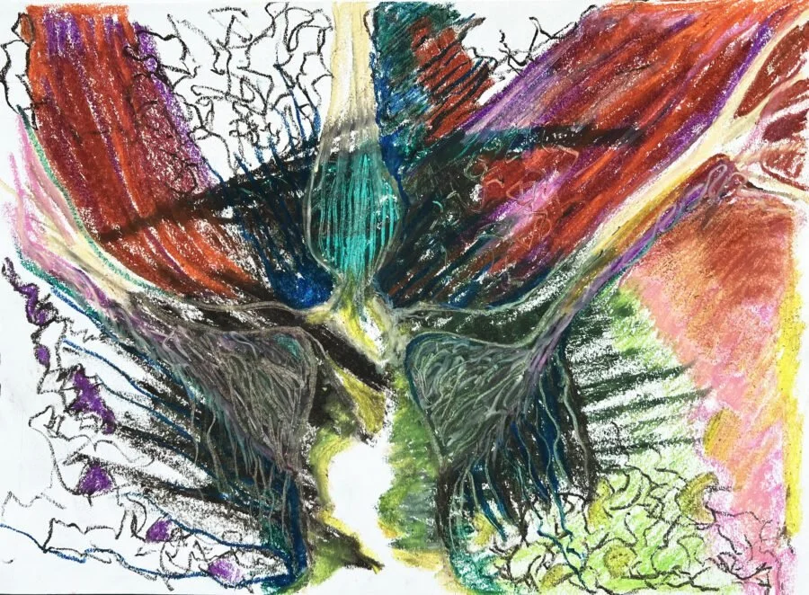 Even though Annu wasn’t a client, Rebecca encouraged her to respond like someone might in art therapy—just intuitively let her hand guide her and trust that something would come out. She felt like watercolors were calling her and created a new image that was inspired by the “up and outward” movement of the marks with the oil pastels and the figure she’d “carved’ into them.