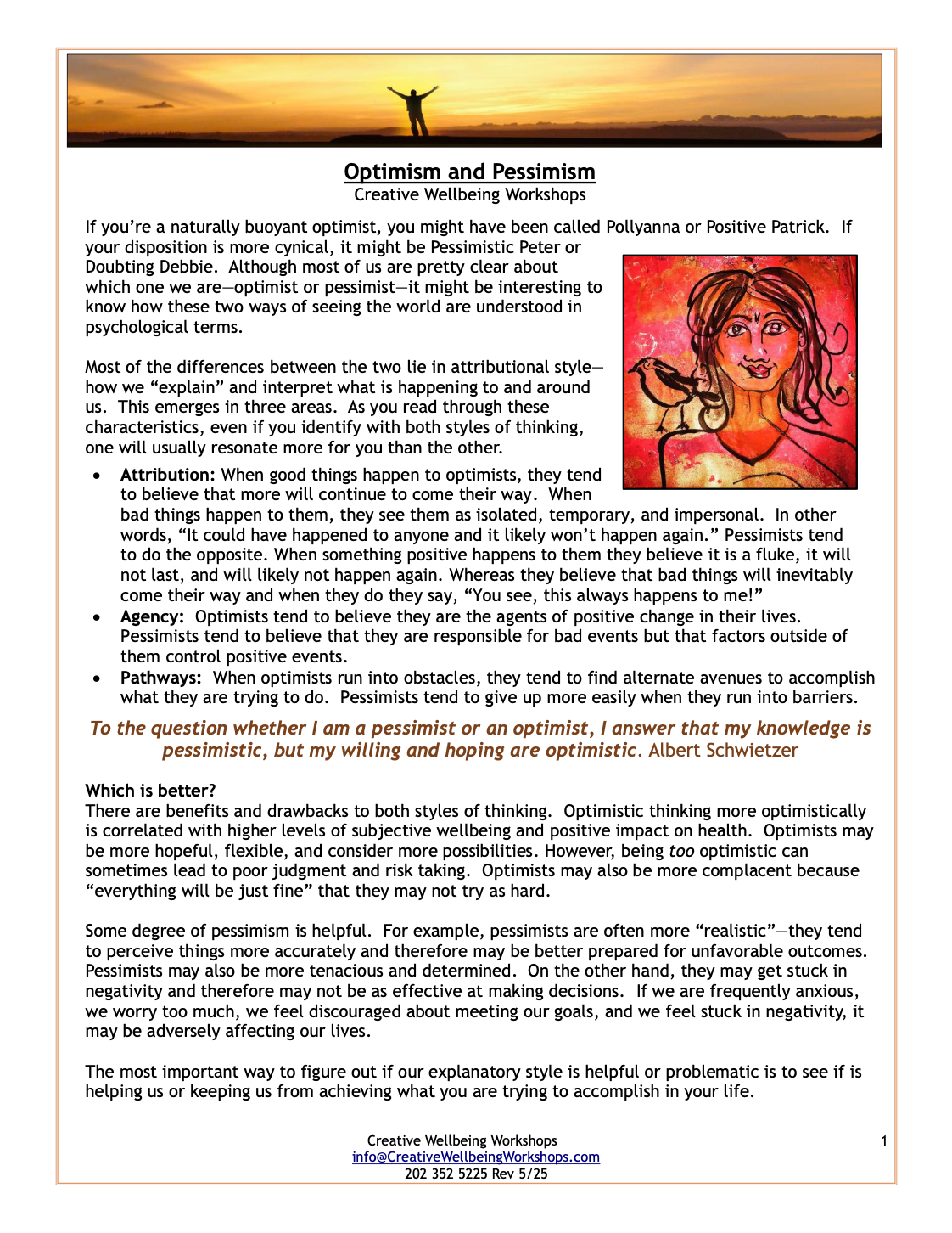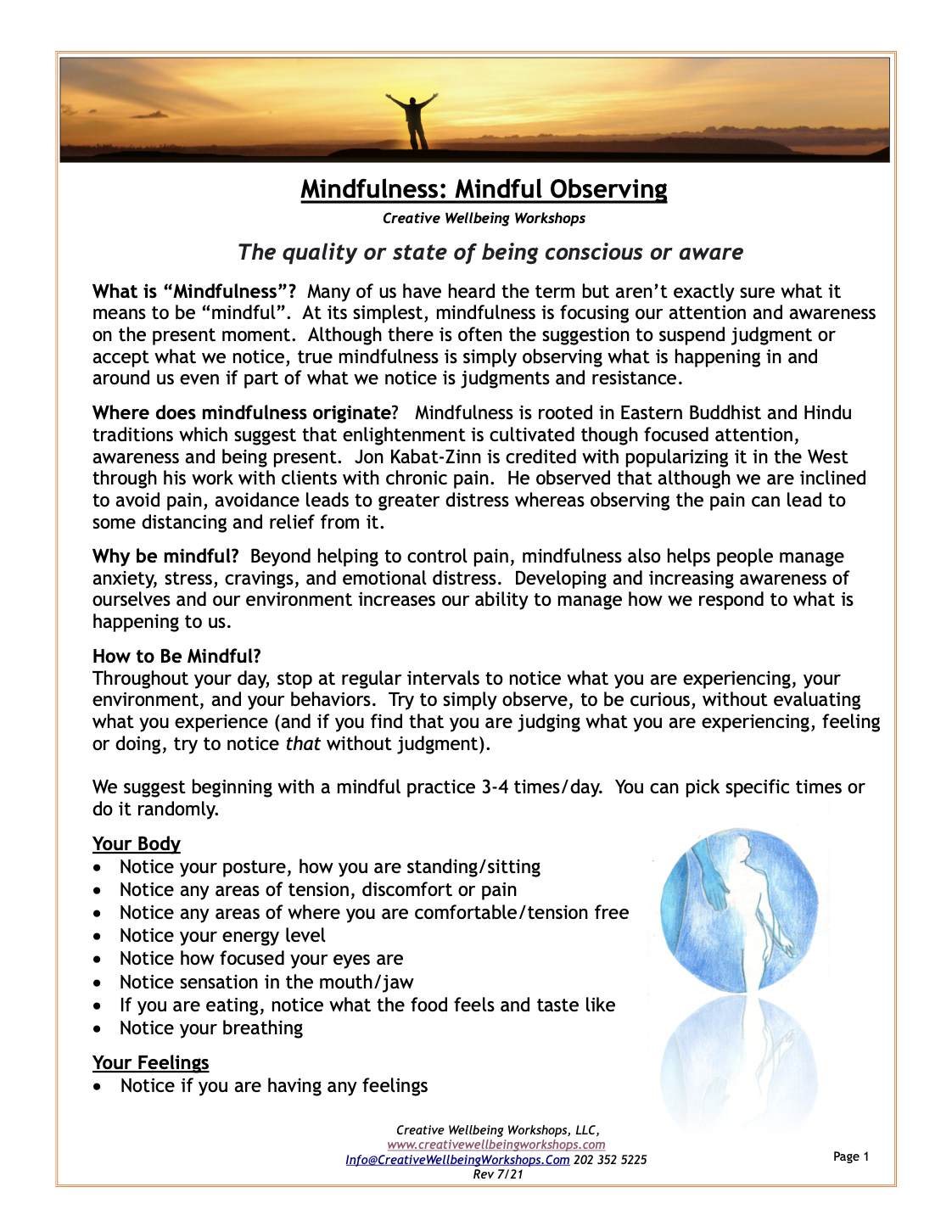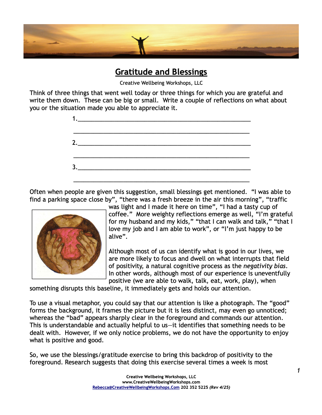 Feel free to download, print, and distribute any of the handouts. We ask that you not alter any of the visual or written content without our permission and please properly cite anything you use. Please contact us with any questions at 202 352 5225 or info@creativewellbeingworkshops.com.